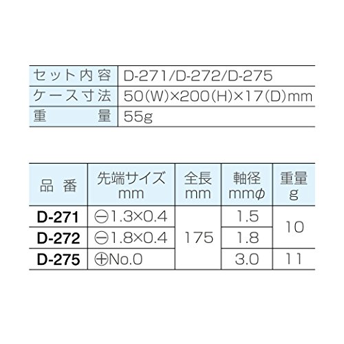 ●耐摩耗性が高く、チップ形半固定ボリュームの調整作業にも、刃先精度を長く保ち続けます。奥まった所にあるパーツの調整に最適です。●強度・ねばりに優れたジルコニアセラミックを使用。●機器内の調整に便利なロング仕様セラミックドライバーです。●軸長110mmで奥まった所にあるパーツの調整に最適です。●半固定ボリューム・コンデンサの調整●セット内容(本):3●軸長(mm):110●全長(mm):175●質量(g):55●セット内容:D-271、D-272、D-275●完全非磁性●グリップから先端までの長さ(mm):110●ハンドル径(mmφ):12●D-271、D-272、D-275●原産国:日本