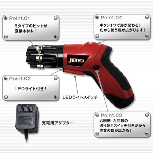 - [ポイント]・6タイプのビットが直接本体に予めセット! ・暗い箇所でも使いやすい!!LEDライト付き! ・充電式のコードレスタイプだから持ち運べがしやすい! ・ボタン一つでグリップ部分の形が変わるので、どんな箇所でも使いやすい!