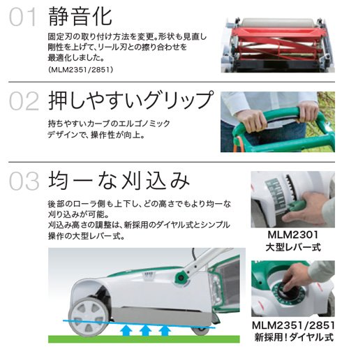 - 仕様 芝刈機/リール式5枚刃 刈込み幅:280(mm) 刈込み能力:約600(m2/H) (目安) 刈込み高さ:5~55(21段階)(mm)(目安) 回転数:2,000(min-1)[回/分] 電源(V):単相100 電流:6.8(A) 消費電力:650(W)