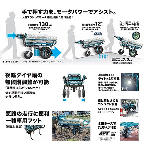 農家、果樹園、造園、建設現場など、あらゆるシーンで活躍。18Vバッテリが使える、「充電式」運搬車が新登場!手で押す力を、モーターパワーでアシスト。大型ブラシレスモータ搭載。優れた走行性能!2スピード切替&ソフトスタートで軽快操作です。たくさんラクラク運べる最大積載量130kg。坂道でもぐんぐん進む高出力ブラシレスインホイールモータで最大登坂能力12°。ブレーキ引き時はモータストップ、強力ブレーキ搭載!使いやすいスイッチ配置、思いのままに軽快操作。ほか、後輪タイヤ幅の無段階調整可能・悪路の走行に便利な一輪車用フット・視界を確保し、ライトの切り忘れを防止するオートオフ機能のついた高輝度LEDライト×2灯・車に積み込めるコンパクト設計・水道ホースで丸洗い可能。