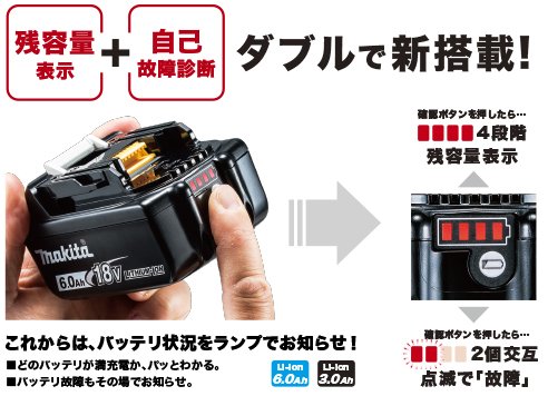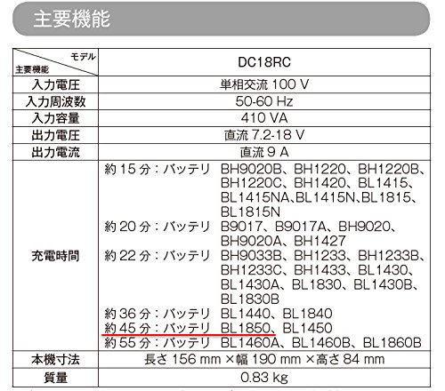連続使用時間:3.0Ahバッテリ使用時の約1.9倍! 4.0Ahバッテリの約1.25倍! 質量:3.0AhのBL1830と同じ650g。 対応充電器:BL1830(3.0Ah/充電時間22分)、BL1840(4.0Ah/充電時間36分)と同じDC18RCで充電時間45分です。