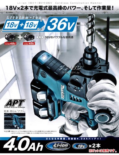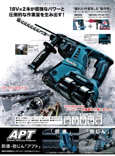 マキタ(Makita)の26mm充電式ハンマドリルです。18Vx2本で充電式最高峰のパワーと作業量を実現! 防滴・防塵「アプト」を搭載しています。本製品は工具本体に、バッテリ2本、充電器、ケースを付属したセットとなります。