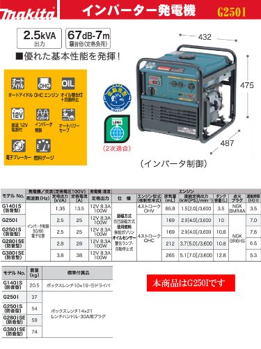 インバーター発電機 2.5kVA 周波数切替型 G250I