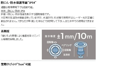 鉛直指示範囲(レーザー光による範囲外の警告方法):±2.0°(消灯)