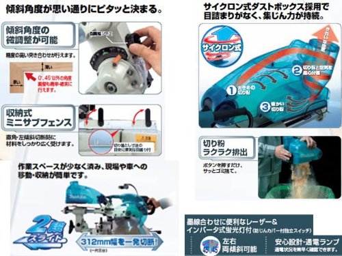 女性にもおすすめ サイクロン式ダストボックス採用でよりクリーンな作業環境を実現 傾斜角度の微調整ができ、狙いどおりに切断 サイクロン式ダストボックス目詰まりがないため、集じん力が持続。ボタンを押すだけで簡単ゴミ捨て。 造作作業に便利な機能傾斜角度の微調整が可能。(精度の高い突き合わせが行なえます。)収納式ミニサブフェンス付。切り落とし寸法の目安に便利な目盛り付。 左右45度、両傾斜可能。墨線合わせに便利なレーザー付。インバータ式蛍光灯付。(防じんカバー付独立スイッチ) 高精度でコンパクト2段スライドでコンパクト、312mm(一尺三
