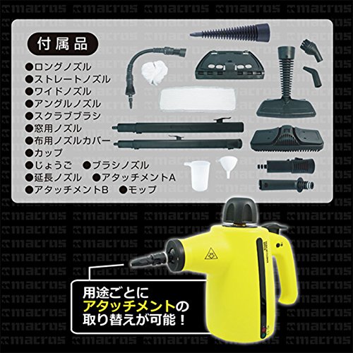 - 付属:ロングノズル92cm、ストレートノズル、ワイドノズル、アングルノズル、スクラブブラシ、窓用ノズル、布用ノズルカバー、カップ、漏斗、ブラシノズル、延長ノズル、アタッチメントA、B、モップ