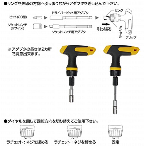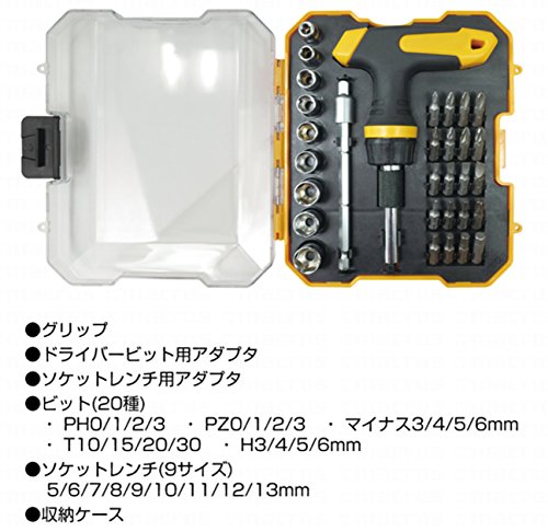 - セット内容:●ラチェットグリップ×1 ●ドライバービット用アダプタ、 ●ソケットレンチ用アダプタ、 ●ビット20種・PHO/1/2/3・PZO/1/2/3・マイナス3/4/5/6mm・T10/15/20/30・H3/4/5/6mm ●ソケットレンチ5/6/7/8/9/10/11/12/13mm ●収納ケース