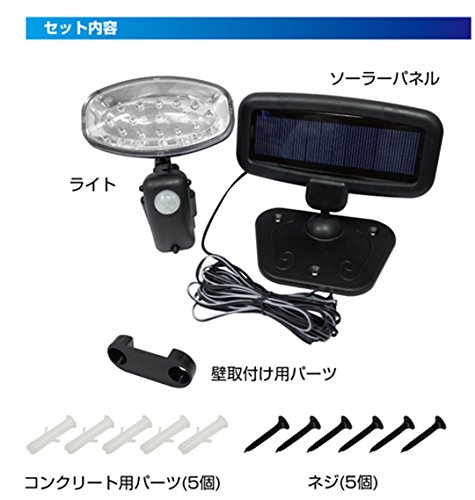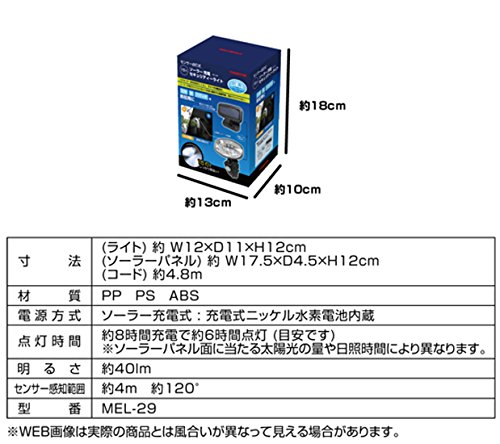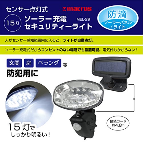 ●15灯ソーラー充電セキュリティーライト●≪特長≫●日中充電夜自動点灯、ソーラー充電だからコンセントのない場所でも設置可能。●電気代もかからない。●感知範囲内に入ると、ライトが自動点灯。●PAKEGE:70g●≪仕様≫●商品サイズ:ライト:約W12×D11×H12cm ソーラーパネル:約W17.5×D4.5×H12 コード:約W4.8m●商品重量:約360g●材質:PPPSABS●パッケージサイズ:約W13×D10×H18cm●電源方式:ソーラー充電式:充電式ニッケル水素電池内蔵●点灯時間:約8時間充電約6時間点灯(目安)●明るさ:約40lm●センサー感知範囲:約4m約120°