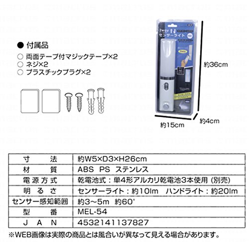 ●室内のあらゆる場所に使える壁掛けセンサーライト!取り外してハンドライトとしても使える便利な2WAY!!●≪特長≫●壁掛けセンサーライトを取り外してハンドライトに!●≪仕様≫●寸法:約W5×D3×H26cm●材質:ABS PS ステンレス●重量:約230g 電源方式:単4乾電池3本●明るさ:センサーライト約10lm ハンドライト約20lm センサー感知範囲:約3~5m
