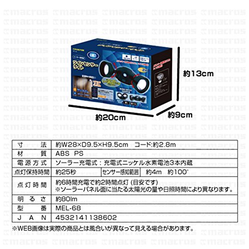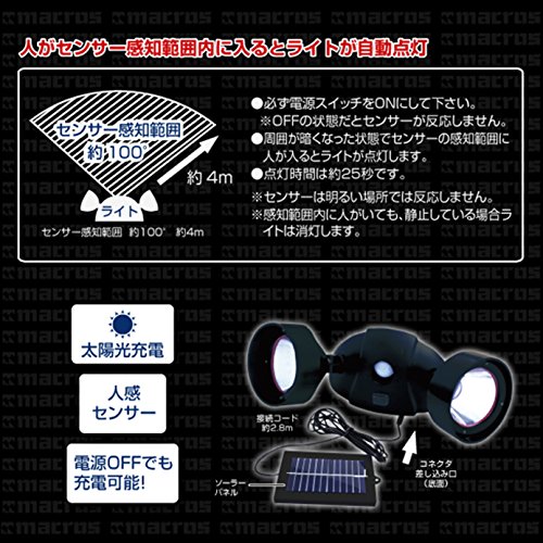 ●ソーラー充電式 ツインセンサーライト●≪特長≫●太陽光充電で、人がセンサー感知範囲に入ると自動点灯!玄関やお庭等の防犯に!●≪仕様≫●寸法:約W28×D9.5×H9.5cm コード:約2.8m●材質:ABS PS●電源方式:ソーラー充電式 : 充電式ニッケル水素電池3本内蔵●点灯保持時間:約25秒●センサー感知範囲:約4m 約100°●点灯時間:約6時間充電で約2時間点灯 (目安です) ※ソーラーパネル面に当たる太陽光の量や日照時間により異なります。●明るさ:約80lm