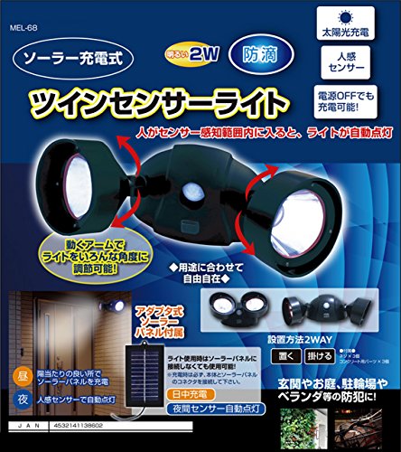 防滴 ソーラー 充電式 明るい 2W 首振り ツイン LED センサーライト MEL-68