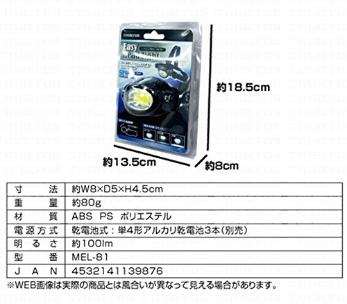 ●イージーヘッドライト●≪特長≫●頭に装着してスイッチを押すだけの簡単操作。●シンプルデザインのヘッドライト●≪仕様≫●寸法:約W8×D5×H4.5cm●重量:約80g●材質:ABS PS ポリエステル●電源方式:乾電池式 : 単4形アルカリ乾電池3本(別売)●明るさ:約100lm