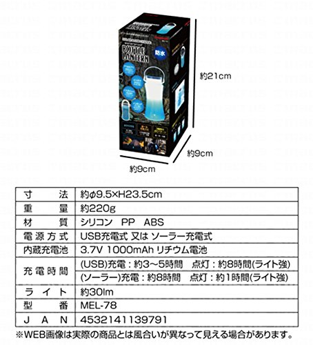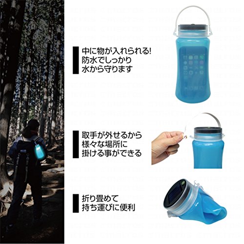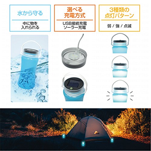 ◆防水・水から守る中に物を入れられる防水でしっかり水から守ります◆選べる充電方式USB接続充電・ソーラー充電◆3種類の点灯パターン弱/強/点滅◆折り畳めて持ち運びに便利取っ手が外せるから様々な場所に掛ける事も出来る◆アウトドアに夜間のランタンキャンプサイトのムード作りにも◆ビーチで砂や水から守りたいときに◆バスタイムに半身浴中等のイルミネーションライトとして◆インテリアドアノブ等に掛けられるので室内灯にも! / ■ 仕 様 ■サイズ(約):直径9.5×高さ23.5cm 重量(約):220g 材質:シリコン、PP、ABS 電源方式:USB充電式、またはソーラー充電式 内蔵充電池:3.7V 1000mAhリチウム電池 充電時間・・・ ・USB充電(約):3~5時間 点灯(約):8時間(ライト強) ・ソーラー充電(約):8時間 点灯(約):1時間(ライト強) ライト(約):30ルーメン /