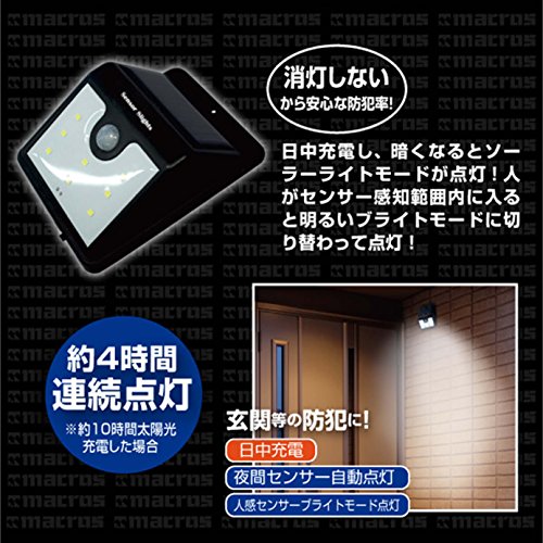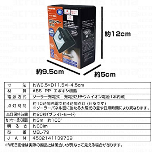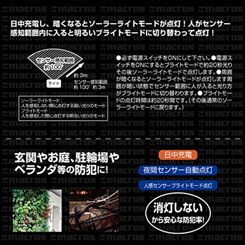 ●消灯しないから安心な防犯率!●≪特長≫●日中充電し、暗くなるとソーラーライトモードが点灯!人がセンサー感知範囲内に入ると明るいブライトモードに切り替わって点灯するソーラーライト●≪仕様≫●寸法:約W8.5×D11.5×H4.5cm●材質:ABS PP エポキシ樹脂●電源方式:ソーラー充電式 : 充電式リチウムイオン電池1本内蔵●点灯時間:約10時間充電で約4時間点灯 (目安です)●※ソーラーパネル面に当たる太陽光の量や日照時間により異なります。●点灯保持時間:約20秒(ブライトモード)●センサー感知範囲:約3m 約100°●明るさ:約80lm
