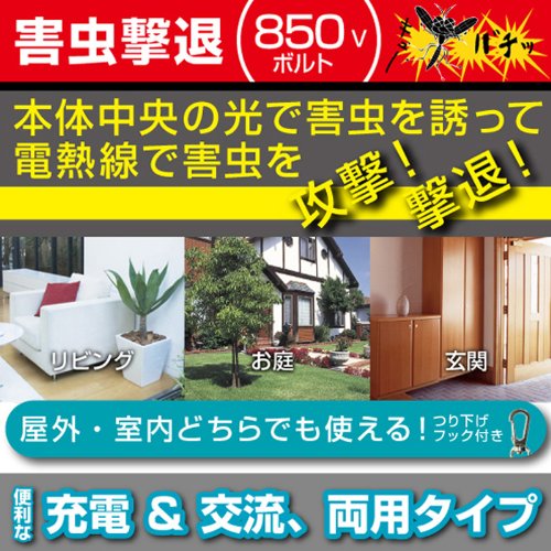●光で誘って電機で害虫を攻撃!≪特長≫●・中央のライトに誘われてやってきた害虫を電熱線で撃退!●・屋外・室内どちらでも使える吊り下げフック付き●・省エネで経済的●・お手入れ簡単●・安全設計●・ペットや人に優しい●・薬剤を使わないから臭いや煙を出さない≪仕様≫●寸法:約W15.5×D10×H22.5cm●重量:約490g(パッケージ含む)●材質:ABS PP 鉄 亜鉛合金●電源方式:交流式、充電式●定格電圧:100V●定格周波数:50/60Hz●定格消費電力:最大4.5W●定格容量:10VA●連続使用時間:約24時間●アダプタDC5V:500mA●充電時作動時間:満充電(約5時間)で約8~10時間作動●内臓充電池:リチウムイオン電池●パッケージサイズ:約W16×D10×24