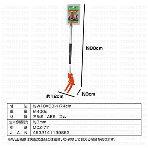 ●マクロス 枝切バサミ らくチョキ MCZ-77●≪特長≫●大切なお庭のお手入れに!ラクラク簡単カット●≪仕様≫●寸法:約W10×D3×H74cm●重量:約400g●材質:アルミ ABS ゴム●生木切断能力:約3mm