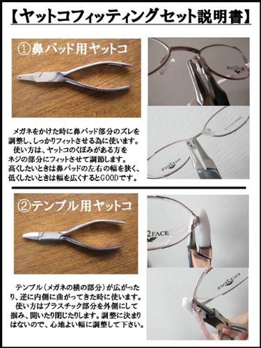 自分でまずメンテナンスする方には必要不可欠なヤットコの修理工具2点です。一般的な方なら基本的にメタルフレームをメンテナンスされると思いますのでこちらで全ての調節が可能です。ツル(テンプル)の付け根だとかあと鼻パットの調整やツル(テンプル)幅の拡がりなども調整できます。市場定価は1個5千円ほどですので合計で1万円ほどです。お子様のいる方ですぐにテンプルが曲がる方やお近くに良いメガネ屋さんがない方におすすめですので本当に便利です。眼鏡がずれ落ちる方にもおすすめです。鼻パッドの調整ができ目と目の間の距離のずれを解消できます。新品保存袋付きです。サイズは全長15cm 幅1.5(5)cm 厚さ1cm 重量120gです。素材はステンレス製です。