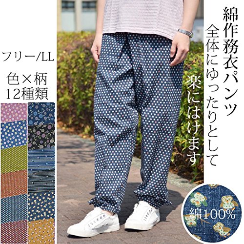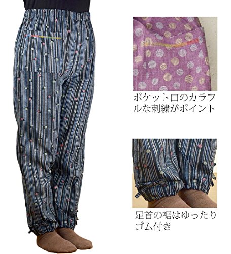 綿100%肌ざわりのいいレディース作務衣パンツです。股上をしっかりとっているので、お腹や背中が出にくくなっています。足首の裾にはゆったりしたゴムが付いています。ゆったりと楽なはき心地でお部屋用として、またガーデニングやちょっとした作業などにも最適。日本製です。