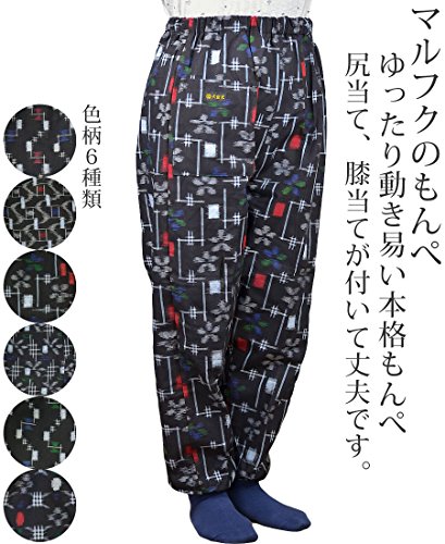 ゆったりと動きやすい綿100%日本製もんぺ。股上をしっかりとっているのでお腹や背中が出にくくなっており、また、尻当と膝当てで補強しています。