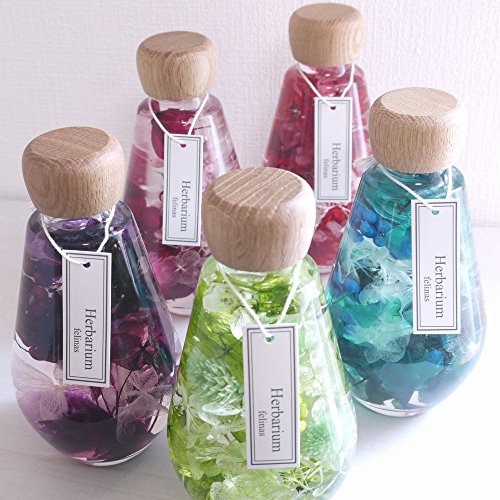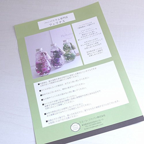 ハーバリウムとは、「植物標本」の意味です。専用オイルに浸すことで、みずみずしい状態でお花や植物をおしゃれなインテリアとしてお楽しみいただけます。 (1年程度)色や形がゆっくりと変化していく過程をお楽しみください。天然素材を使用していますので、写真の画像の作品とは素材の大きさや長さが若干異なります。 ■内溶液は、耐火温度を高め(290°C)に設定した燃えにくいオイルですが、火気の近くや直射日光は避けてご使用ください。・オイルが目に入った場合は、水でよく洗い流してください。 ■飲料ではございません。絶対に飲まないでください。 ■お子様やペットの手の届かない所に置いてください。 ■オイルは流し(下水道)に流さないでください。廃棄する場合は、食用油の廃棄と同様に新聞紙や古布に染み込ませて可燃ごみとして廃棄してください。 ■本来の用途以外には使用しないでください。 ■容器はガラス製です。強い力を加えたり、落下させると破損することがございます。お取扱いには十分ご注意ください。