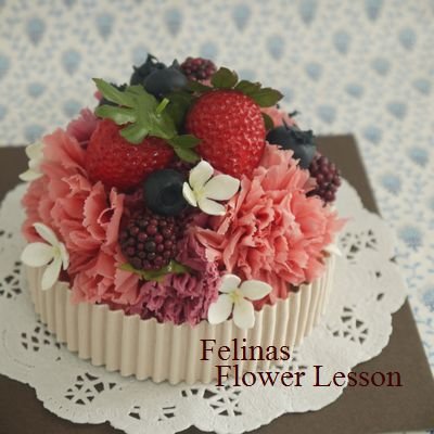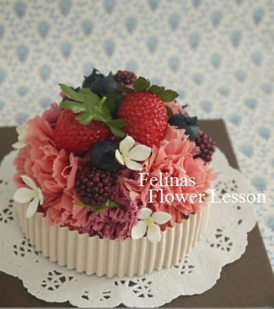 - プリザーブドフラワーのカーネーションを クリームに見立ててフルーツタルトの アレンジメントです ベリーをたっぷり使って見た目にも おいしそう!