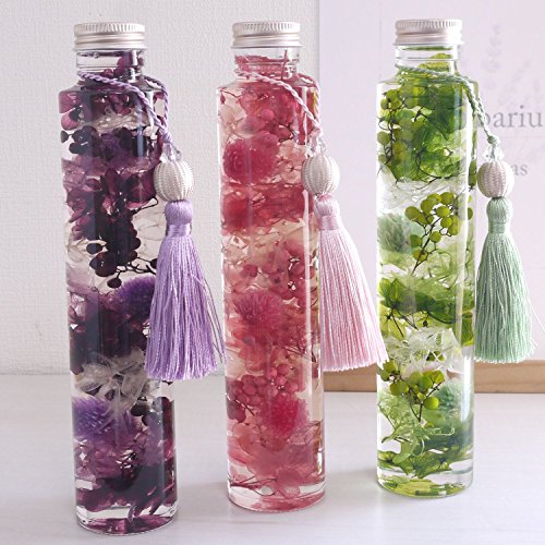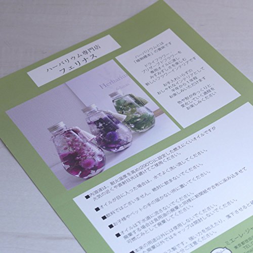 ハーバリウムとは、「植物標本」の意味です。専用オイルに浸すことで、みずみずしい状態でお花や植物をおしゃれなインテリアとしてお楽しみいただけます。 (1年程度)色や形がゆっくりと変化していく過程をお楽しみください。天然素材を使用していますので、写真の画像の作品とは素材の大きさや長さが若干異なります。 ■内溶液は、耐火温度を高め(290°C)に設定した燃えにくいオイルですが、火気の近くや直射日光は避けてご使用ください。・オイルが目に入った場合は、水でよく洗い流してください。 ■飲料ではございません。絶対に飲まないでください。 ■お子様やペットの手の届かない所に置いてください。 ■オイルは流し(下水道)に流さないでください。廃棄する場合は、食用油の廃棄と同様に新聞紙や古布に染み込ませて可燃ごみとして廃棄してください。 ■本来の用途以外には使用しないでください。 ■容器はガラス製です。強い力を加えたり、落下させると破損することがございます。お取扱いには十分ご注意ください。