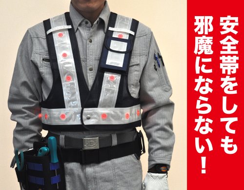●業界初のショート丈タイプ。通常のLEDベストよりも丈が短いので、安全帯をつけても邪魔にならない。腰にもLEDがついて合計20個で抜群の視認性。横からも見えやすい。 安全帯をつけても邪魔にならない。反射幅60mm 寒冷地-10℃対応反射材使用。【注意事項】●ポケット部にはLEDなし。●洗濯不可。