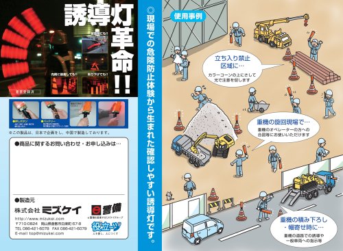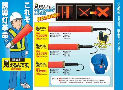 世界初!誘導灯「見えるんです。」は通常の誘導灯と比べ明るさが2倍で視認性も抜群!!命を守る誘導灯です。【特長】・視認性抜群の誘導灯「見えるんです。」・従来の誘導灯と比べ、幅が広く見やすい設計に明るさも2倍に。・緊急時・災害時などや、警備や工事などの現場で吊り下げたり、 三角コーンとの併用も可能です。【使用方法】・バッテリーは単2乾電池×2個使用。 しかし、電池アダプターケースを使う事によって 単3電池×2個でも使えます。・押しボタンを押す事により、点灯→消灯→点滅→消灯を繰り返します。使用テスト例)◆耐久温度:80℃/-20℃〔24H(電池入)問題なし〕◆単2電池(アルカリ)2個使用 約80時間(1日の内8時間の使用にて) 輝度は24〜30時間(連続使用にて)