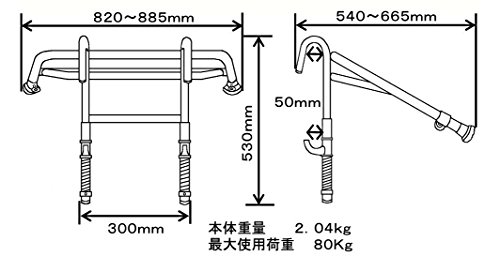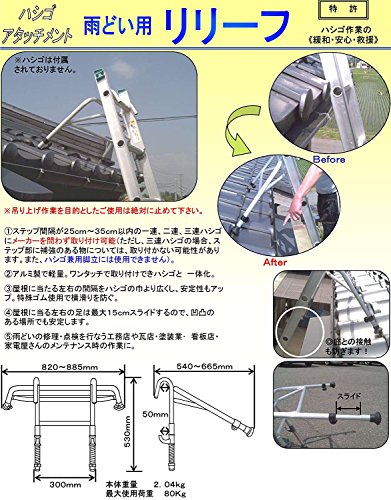 - ステップ間隔が25cm〜35cm以内の一連または二連バシゴであればメーカーを問わず取り付け可能。アルミ製で軽量。ワンタッチの取り付けでハシゴと一体化。