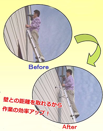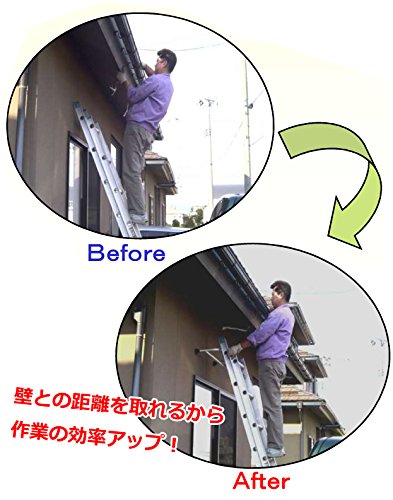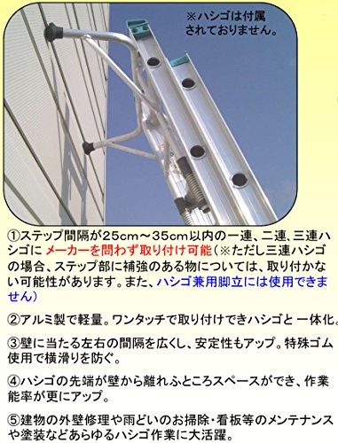 - ステップ間隔が25cm〜35cm以内の一連または二連バシゴであればメーカーを問わず取り付け可能。アルミ製で軽量。ワンタッチの取り付けでハシゴと一体化。