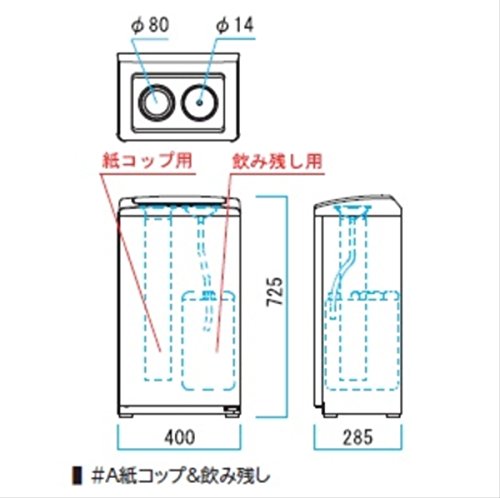 ●組み合わせによって紙コップ(60?78φ)の回収(約100個)と飲み残し(約10L)を回収できる分別屑入です。