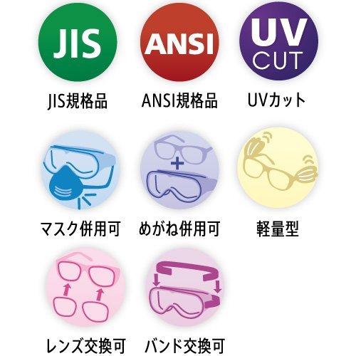 ●レンズ色:クリア●JIS T 8147規格品●ANSI規格品(Z87.1)●通気孔付●レンズ厚:1.6mm●メガネと併用しやすいスタンダードな形状です。●レンズ、バンドの交換が可能です。
