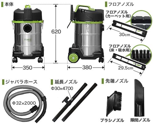 オフィスやホテル、車内やガレージ・倉庫などの汚れやすい場所の掃除に活躍!サビに強いステンレスボディを採用。乾湿両用のため液体も吸い込み可能で、食堂やレストランなどの水周りの掃除にもお使い頂けます。ノズルが3種類付属しており、乾いた場所・湿った場所・隅や狭い場所など様々な用途にご使用いただけます。 ※ご注意※ 本商品は、湿ったゴミや若干の液体を吸い込む事は可能ですが、ポンプのように液体のみを大量に吸い込む事はできません。