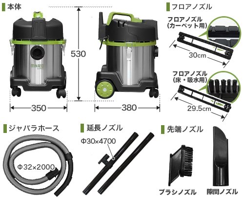 オフィスやホテル、車内やガレージ・倉庫などの汚れやすい場所の掃除に活躍!サビに強いステンレスボディを採用。乾湿両用のため液体も吸い込み可能で、食堂やレストランなどの水周りの掃除にもお使い頂けます。ノズルが3種類付属しており、乾いた場所・湿った場所・隅や狭い場所など様々な用途にご使用いただけます。 ※ご注意※ 本商品は、湿ったゴミや若干の液体を吸い込む事は可能ですが、ポンプのように液体のみを大量に吸い込む事はできません。