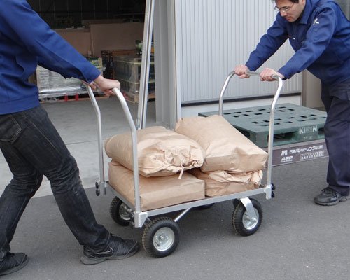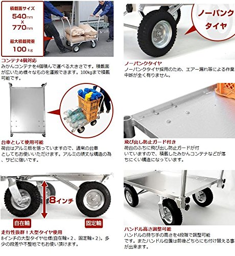 アルミ製の中型コンテナ運搬台車です。2人作業両ハンドル型は重量物を無理なく運搬し狭い場所の移動もより簡単になります。ボディはアルミ製のためサビに強く、みかんコンテナや高温の荷物などの運搬に適しています。通常のコンテナ台車と違い、荷台にアルミ板を張っていますので、コンテナの運搬に限らず一般の台車としてもご使用可能です 。また、8インチのノーパンク(自在輪×2本、固定輪×2本) を使用しているため、走行自由度が抜群で多少の段差や不整地でもお使い頂けます。