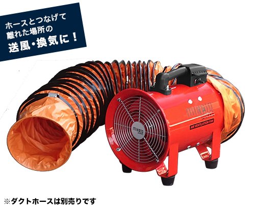 口径300mmのダクトファンです。風量の必要な工場・畜産などのダクト換気はもちろん、暑い時期の草刈り作業など屋外作業での扇風機としても活躍。また別売りのダクトホースをつないで、離れた場所での送風・吸気が可能。1台で排風⇔送風のいずれも使用できます。 ※この商品は防爆構造にはなっておりません。 可燃性、爆発などの可能性のある現場にはご使用になれません。