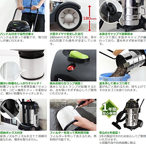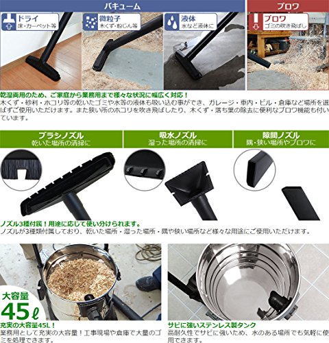 オフィスやホテル、車内やガレージ・倉庫などの汚れやすい場所の掃除に活躍!サビに強いステンレスボディを採用。乾湿両用のため水も吸い込み可能で、食堂やレストランなどの水周りの掃除にもお使い頂けます。ノズルが3種類付属しており、乾いた場所・湿った場所・隅や狭い場所など様々な用途にご使用いただけます。