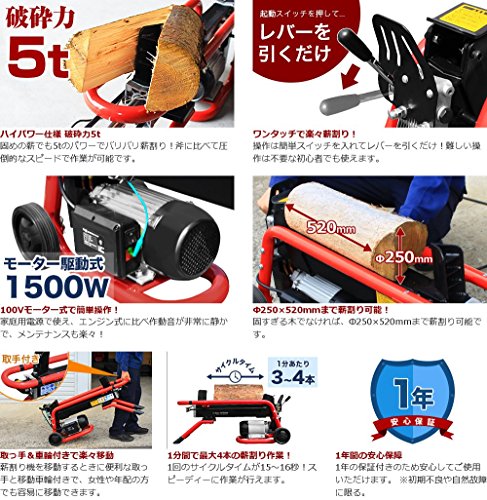 家庭用100Vの電動薪割り機です。5トンの油圧パワーで手斧に比べ圧倒的なスピードで薪を割る事ができます。レバーを引くだけでどなたでも簡単に操作することができます。エンジン式に比べ作動音も非常に静かで、メンテナンスの手間も大幅に少ないのが特徴です。