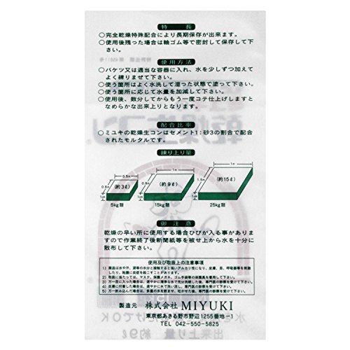 ●【商品説明】●「ミユキの乾燥生コン 15kg」は、水を加えて練るだけで、面倒な配合の手間が省け簡単に良質なモルタルを作ることができます。●普通ポルトランドセメントに砂(2.5mm以下)を混合しました。●コテ伸びが良いので、薄塗り工法ができます。●水引けが早いので、作業の能率が上がります。●適正な粗粒率の砂がセメント効果を高めるため亀裂の心配がありません。●長期保存が可能です(完全乾燥)。●【お問い合わせ先】●株式会社MIYUKI042-550-5825●【製品仕様】●内容量:15kg●配合比率:セメント1・砂3●出来上がり量:約9L●分類:セメント系プレミックスモルタル●用途:土間・土台・塀などの基礎工事、ブロック・レンガ積み工事、水回りの補修工事等●【ご注意】●※乾燥の早いところに使用する場合、ひびが入ることがありますので、作業終了後新聞紙などを被せ、上から水を十分に散布してください。●【使用及び取扱上の注意事項】(1)商品は水や汗、涙等の水分と接触すると強いアルカリ性になり、皮膚、目、呼吸器等を刺激したり、粘膜に炎症を起こすことがあります。●(...