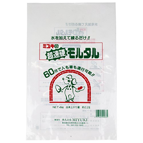 ●【商品説明】●「ミユキの超速硬モルタル 4kg」は、硬化が速く、スピード施工に高い効力。●接着性に優れ、作業性が良くて仕上がりバッチリです。●60分で人も車も通行可能です。●モルタル作りに必要なものがすべて配合されており、水を少量加えて練るだけで、思いのままの硬さのモルタルが作れます(夏期は速硬度が増します)。●普通のセメントではなく、速く固まる超速硬セメントを配合していますので、お急ぎの作業には時間短縮になり、大変便利です。●【お問い合わせ先】●株式会社MIYUKI042-550-5825●【製品仕様】●内容量:4kg●出来上がり量:約2.2L●補修用●分類:セメント系プレミックスモルタル●用途:水漏れの補修など、直ちに仕上げたい緊急工事、アンカーボルト等、短時間で固定したい時、他各種補修工事●【応急処置】●目に入ったら清浄な水で速やかに洗眼し、鼻から吸引してしまったら直ちに鼻をかんでください。●口に入ったらうがいをし、皮膚に付着した時は石鹸で水洗いしてください。●必要に応じて医師の処置を受け、飲み込んだ場合は必ず医師の診察を受けてください。●【...