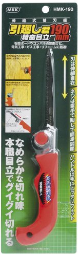 ●刃先は伸縮可能だから用途に合わせた長さで使用できる!●電気工事、ガス工事、リフォーム時の石膏ボードやコンパネの窓開けに最適!●サビやヤニに強い特殊表面加工を施しであります。●刃はインパルス処理で2~3倍永切れ(衝撃焼入)。●精密目立てでなめらかな切れ味を実現!●手で回せる伸縮用螺子で、刃は用途に合わせた長さで使用できます。●連続作業でも疲れにくいグリップ形状です。●ロングサイズタイプ●刃部:伸縮自在(全収納可)/インパルス処理●刃長:190mm●素手で回せる六角調整ネジ●刃部:SK5(ニッケルメッキ)●本体:鉄(亜鉛メッキ)●グリップ:ミラストマー●55×255×25mm●129g●日本製