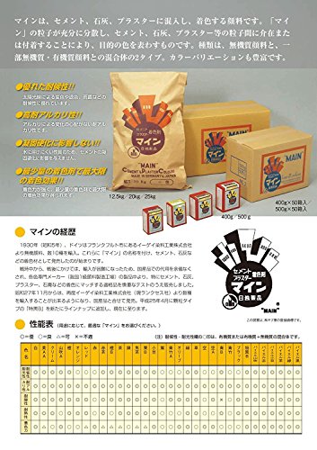 マインは、セメント、漆喰、石膏プラスターなどに混入し、着色する顔料です。マインの粒子が十分に分散し、セメント、漆喰、石膏プラスターなどの粒子間に介在または付着することにより、目的の色を表現します。種類は、無機質顔料と、一部無機質・有機質顔料との混合体の2タイプ。カラーバリエーションも豊富です。