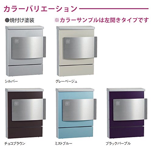 郵便ポスト 壁付けポスト クルム カジュアルからシンプルまで幅広く対応出来るデザインポスト あらゆる門柱、壁にフィットするデザイン サイズ W337(鍵部を含む)×H420×D124mm 4.8kg 投函口:W250xD38mm カラー ・グレーベージュ ・シルバー ・チョコブラウン ・ミストブルー ・ブラックパープル 仕様 ・左開き仕様 ・右開き仕様 仕様機能 壁付け仕様(別途商品オプションスタンドの使用でスタンド設置可能です。) 鍵付き(鍵を使用する事なく扉の開閉が出来る簡易錠機能付き ) 材質 本体:ZAM(高耐食溶融めっき鋼板)/取手パネル:アルミ 備考・注意 ※扉の吊り元を変更する事は出来ません。 (左開き仕様はポストを正面に左側が扉の吊り元です。右開き仕様はポストを正面に右側が扉の吊り元です。) ※画像は使用するブラウザにより色が違って見える場合があります。 ※施工には、専門的な知識と、道具、技能が必要となります。お近くの工事店 (例:外構をした会社)にて設置を依頼して頂くようお願い致します。