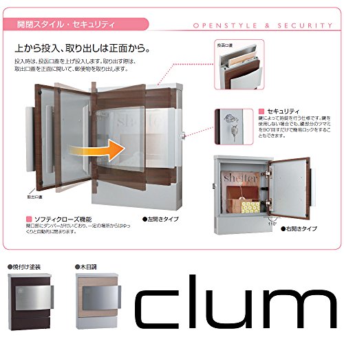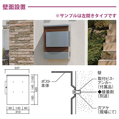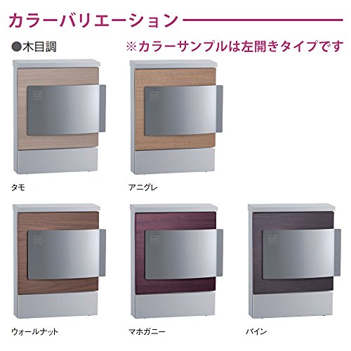 郵便ポスト 壁付けポスト クルム 木目調タイプ カジュアルからシンプルまで幅広く対応出来るデザインポスト あらゆる門柱、壁にフィットするデザイン サイズ W337(鍵部を含む)×H420×D124mm 4.8kg 投函口:W250xD38mm カラー ・タモ ・アニグレ ・ウォールナット ・マホガニー ・パイン 仕様 ・左開き仕様 ・右開き仕様 仕様機能 壁付け仕様(別途商品オプションスタンドの使用でスタンド設置可能です。) 鍵付き(鍵を使用する事なく扉の開閉が出来る簡易錠機能付き ) 材質 本体:ZAM(高耐食溶融めっき鋼板)/取手パネル:アルミ 備考・注意 ※扉の吊り元を変更する事は出来ません。 (左開き仕様はポストを正面に左側が扉の吊り元です。右開き仕様はポストを正面に右側が扉の吊り元です。) ※画像は使用するブラウザにより色が違って見える場合があります。 ※施工には、専門的な知識と、道具、技能が必要となります。お近くの工事店 (例:外構をした会社)にて設置を依頼して頂くようお願い致します。