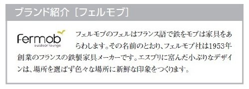 ●エレガントなフォルムが印象的なフランス・フェルモブ社のファニチャー。その高いデザイン性もさることながら、快適な座り心地と優れた耐候性も魅力。クラシカルなデザインも追加したハイクオリティな逸品です。