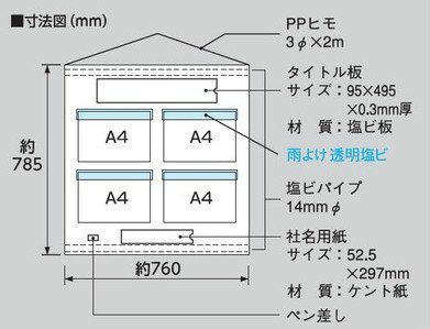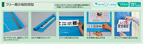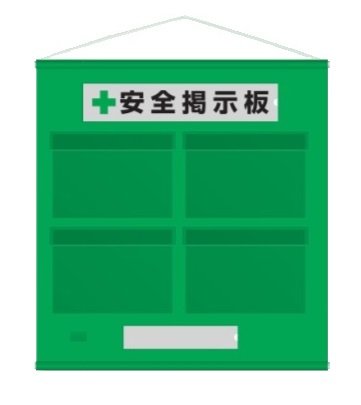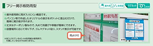 防雨型、屋外使用時に雨が入りにくくなっています。 パソコンなどで製作したオリジナルの書式をポケットに差し込むだけで、 簡単に安全掲示板が作れる商品です。 軽いうえに丸めて持ち運びができるので、移動・設置がとても簡単です。 横:785mm 縦:760mm 質量:790g ポケットサイズ:A4ヨコ4箇所 取付仕様:マグネット/吊下げ 裏面上下ゴムマグネット・上下パイプ入り・吊下げひも付 材質:ターポリン製 原産国:日本