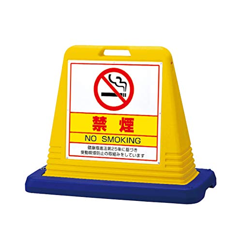 視認性を高め、街の景観にマッチしたデザインに大きな表示で安定感抜群の標識です。 【特長】 樹脂製なので人や車にやさしい安全設計です。 積み重ねて保管が出来る省スペース構造です。 表示内容:禁煙 メーカー品番:874-191 片面表示:裏面は本体と同一色です。 サイズ:403×835×650mm カラー:イエロー 材質:高密度ポリエチレン 重量:4.7kg(満水時:約11.1kg) 標識サイズ:445×445×1mm厚 標識材質:透明PET樹脂(穴上3中2下2)裏印刷、白PET樹脂(穴上3中2下2)表印刷 製造:ユニット株式会社