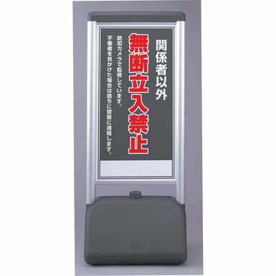 駐車場・各種施設案内表示 サインシック Bタイプホテルや大型施設の雰囲気に合わせた、落ち着きのあるデザインです。 【特長】 アルミ材を使用し、美しさと質感を兼ね備えた存在感のあるデザインです。 樹脂製ウォーターウェイト一体型なので、屋内でも使用できます。 移動も便利なキャスター付きです。 視認性の高い大きな表示案内です。 表示:関係者以外無断立入禁止 メーカー品番:865-811 印刷:片面 裏白無地 サイズ:410×510×1236mm カラー:グレー、支柱/シルバー(アルトマイト加工) 材質:高密度ポリエチレン、支柱/アルミ押し出し材 重量:6.6kg(満水時:約42.5kg) 表示版サイズ:820×430×3mm厚(表示面サイズ:795×410mm) 表示版材質:アルミ複合板(白) 製造:ユニット株式会社
