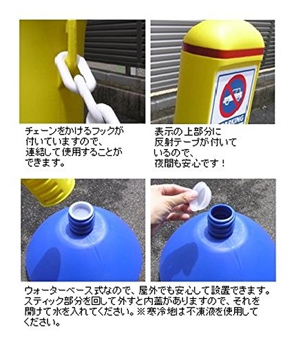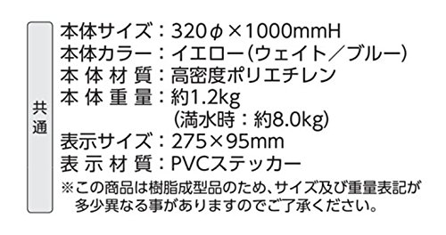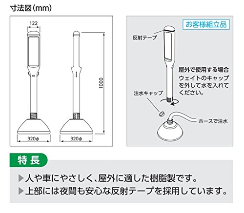 【特長】 スマートで場所を取らないデザインなので狭い場所にも設置できます。ウォーターベース式なので、屋外でも安心して設置できます。別売りのチェーン等でつなげて設置することで広範囲を仕切ることもできます。反射テープ付きで夜間の視認性も抜群です。 メーカー品番:835-140A本体のみ サイズ:径320×1000mm 材質:高密度ポリエチレン 重量:1.2kg(満水時:約8.0kg)表示 ステッカーサイズ:275×95mm 表示材質:PVCステッカー 製造:ユニット株式会社
