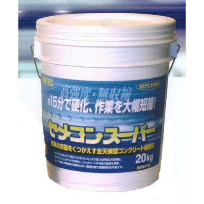ユニテック セメコンスーパー コンクリート補修材 20Kg道路など時間をかけられない場所の補修に スピード硬化で、作業を大幅短縮 約10分で硬化、コンクリートの4倍の強度を発揮、 従来の常識を覆す全天候型コンクリート補修材。 ・水だけですぐ使える ・ ・材 質 :シリカサンド、特殊セメント ・圧縮強度 :70~78N/mm2 ・曲げ強度 :5~6N/mm2 ・品質保持期間 :密閉状態で長期保存可能 用法 高速道路・駅階段や公衆トイレ、集水枡などコンクリート製品の補修など、 交通量の多い場所や水周りの緊急を要する工事に最適。 アンカーボルトの埋め込みなどにも。
